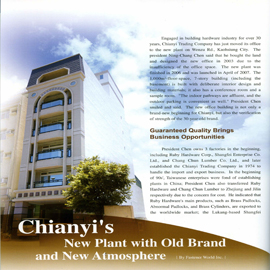 CHIANYI TRADING COMPANY was established in Taiwan since 1974. There are two main divisions with different products to be made from different Country, Taiwan, China, Malaysia and Indonesia.They are including:RUBY HARDWARE CORP. is specialist of Builder's Hardware, including Door Hardware, Window Hardware, Bathroom Accessories and all kind of Hooks in Taiwan and China. Also, we have been working for LOCKS with million pieces capacity monthly for Brass Padlocks, Iron/Steel Padlocks and Abnormal Padlocks to cover all quality grades as well as Cylindrical Door Lockset, Mortise Door locks and Brass Cylinders in China.Chang Chun Lumber Co., Ltd. which is a professional maker of all kinds of door skins and wooden doors in Taiwan and China. Our main door skins include HDF Door Skin, Veneered Door Skin and Melamine Door Skin. We ship more than 50 containers monthly for Veneered Door Skins and Melamine Door Skins respectively. The total amount is more than 100 containers monthly. Our main market are in the Mideast Asia and India. Our Melamine door skins are with advanced technology. We have ML style (one direction of wood grain), MD style (two directions of wood grain) and MT style (MD with texture face). We may give good solution for our door skin purchaser how to make good door. Besides door skins, we make all kinds of wooden door and door frame sets. We have advanced technology for making Melamine Door Sets with PU foam cores. They are very stable and elegant product. We can accept any OEM order.